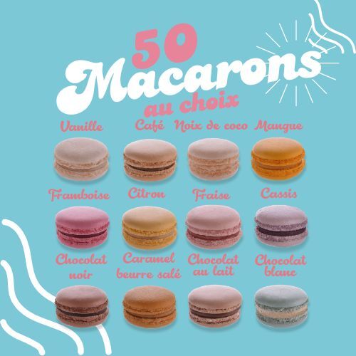 Nous proposons une large variété de parfums de macarons, comprenant des classiques tels que vanille, chocolat, fraise, citron, ainsi que des saveurs plus originales telles que noix de coco, caramel beurre salé, framboise, et bien d’autres encore.